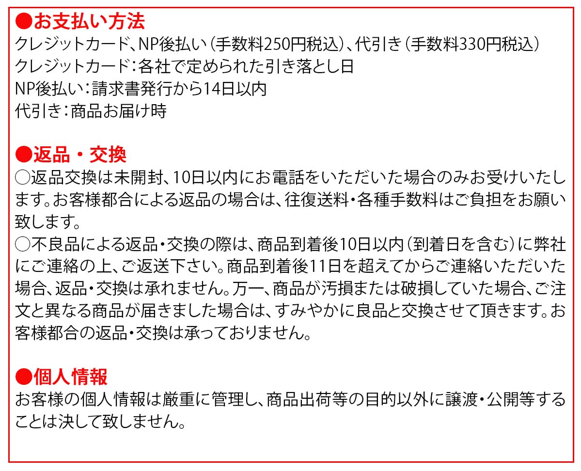・お客様都合の返品は商品到着後7日以内にお電話にてご連絡の上、『未開封・未使用の物のみ』ご対応いたします。なお、ご返品にかかる送料・手数料はお客様にてご負担いただきます。