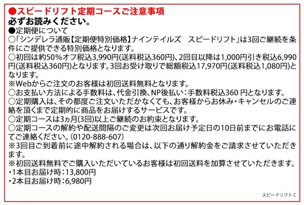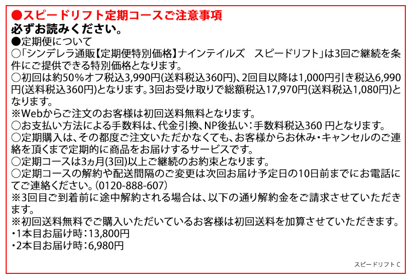 - 「シンデレラ通販【定期便特別価格】ナインテイルズ スピードリフト」は3回ご継続を条件にご提供できる特別価格となります。